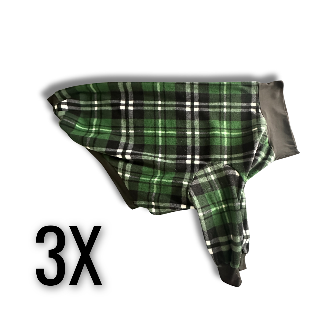 Dress your pup in cozy style with this bold green and black plaid fleece crewneck with black trim. Perfect for cooler days, this garment combines comfort with a dash of rustic charm.