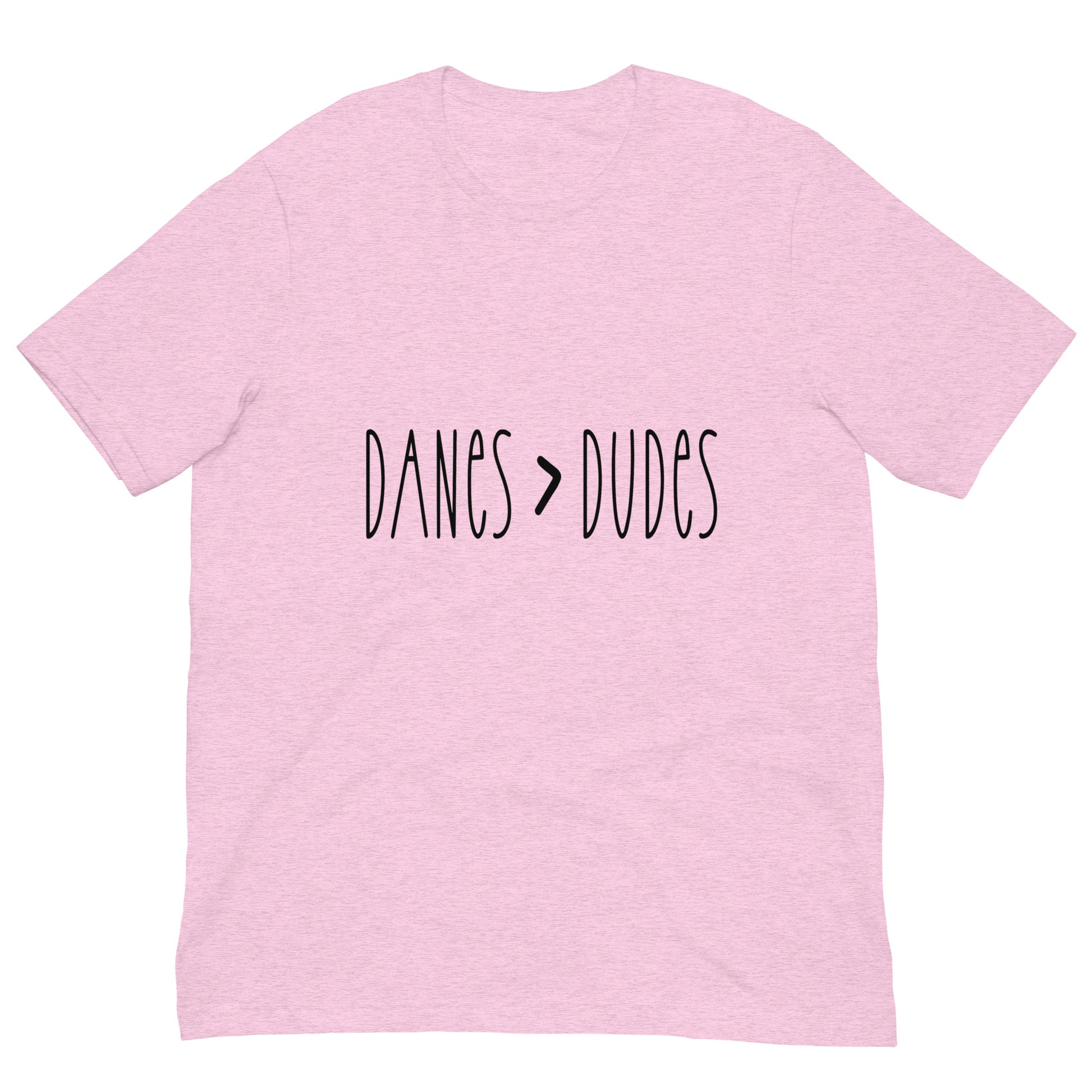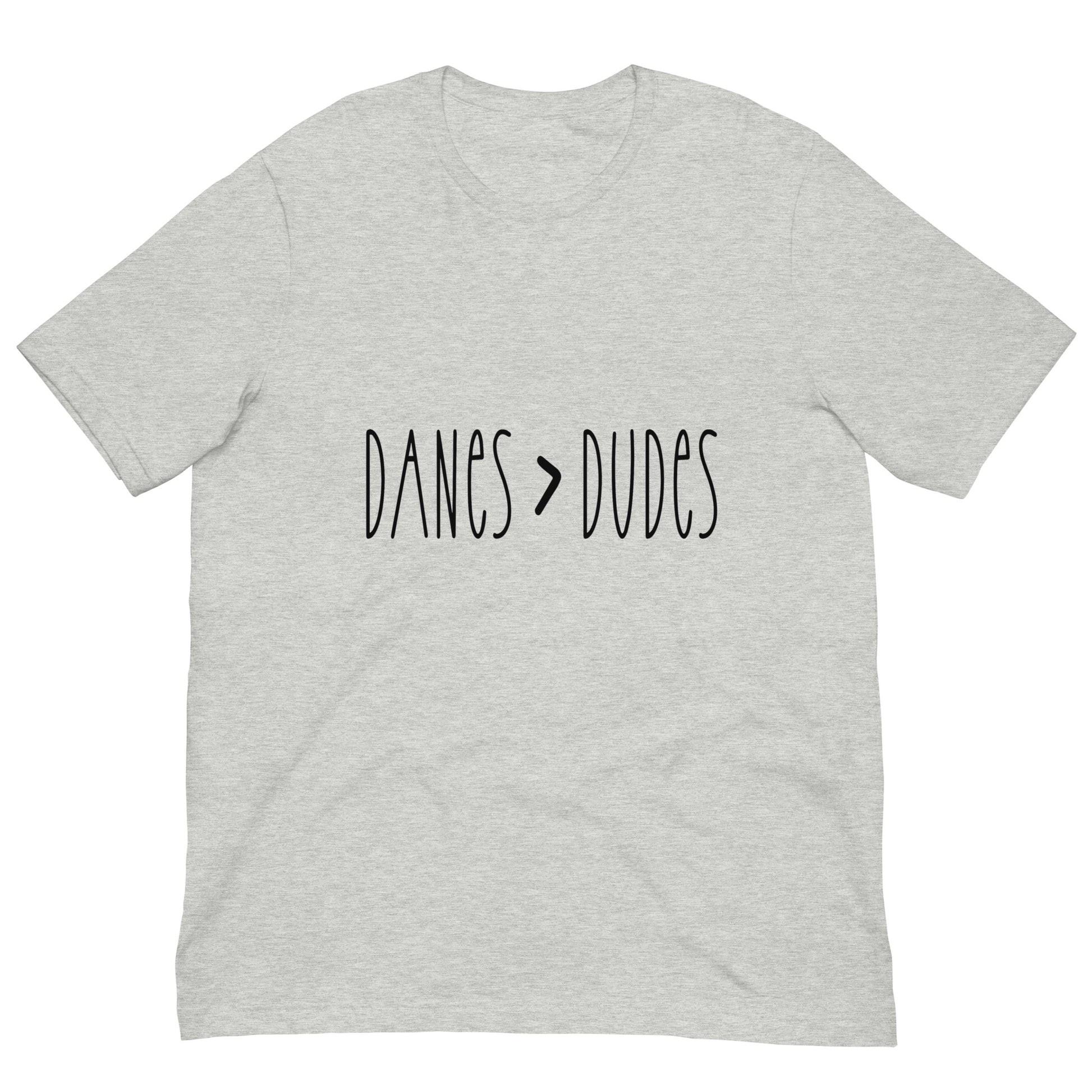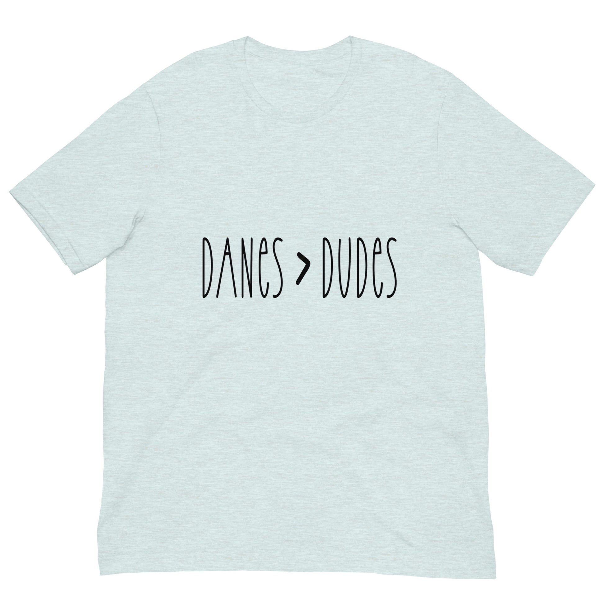 Whether you're out for a walk with your Dane, grabbing a coffee with friends, or simply lounging at home, this shirt is the perfect way to show off your love for your furry best friend. So what are you waiting for? Get your paws on the "Danes > Dudes" T-Shirt today and let the world know who really has your heart!