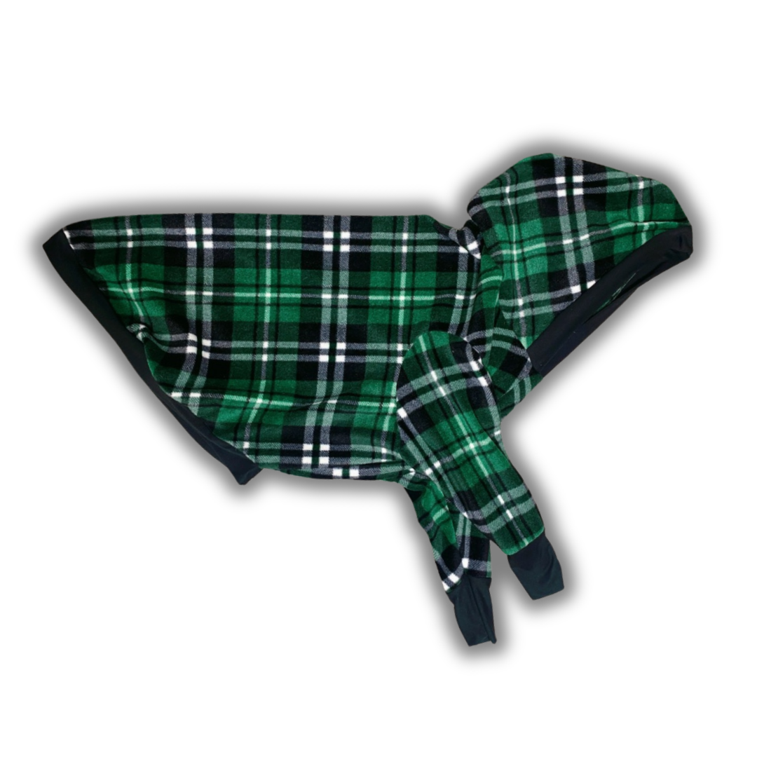 Wrap your pup in the cozy embrace of our Green & Black Plaid Fleece, where classic design meets snug warmth. Perfect for chilly days or just lounging at home, this fleece brings a touch of timeless elegance to your dog's wardrobe. Designed with Great Danes in mind, this jammie is versatile enough for any breed looking to stay warm and stylish. The soft fleece fabric offers exceptional comfort and warmth, making it an ideal choice for your dog's winter attire.