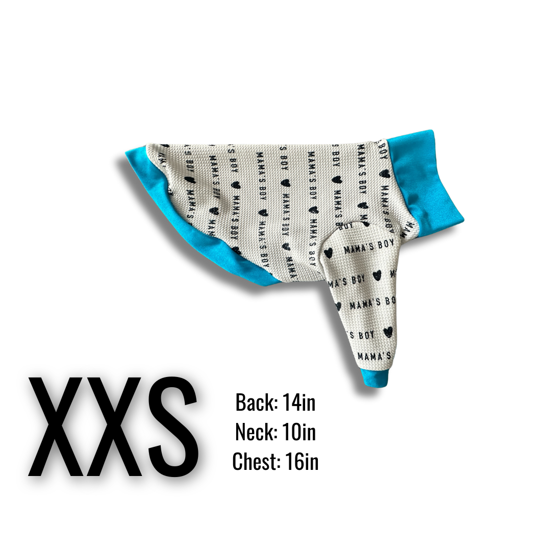 Show off your pup's love with our "Mama's Boy" Crew, featuring bold blue trim on a fun, text-patterned fabric. This ready-to-wear XXS size offers both style and comfort.