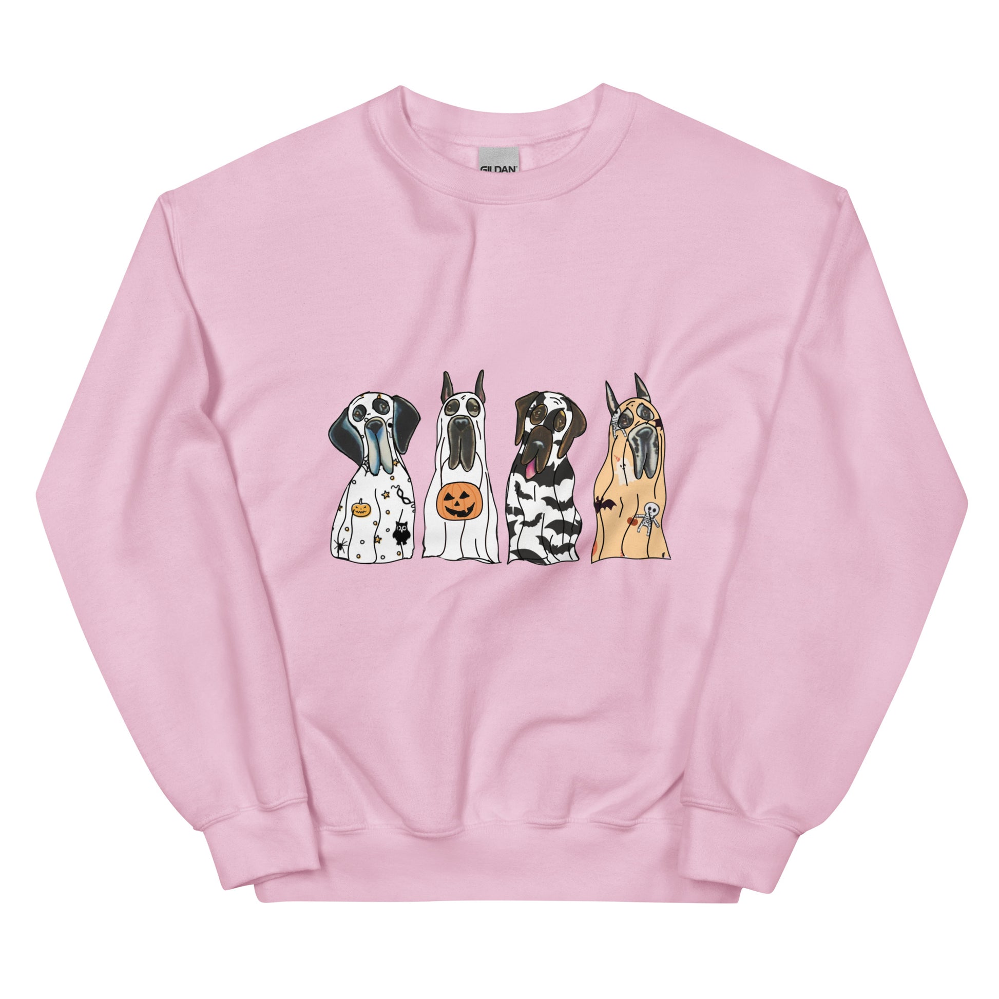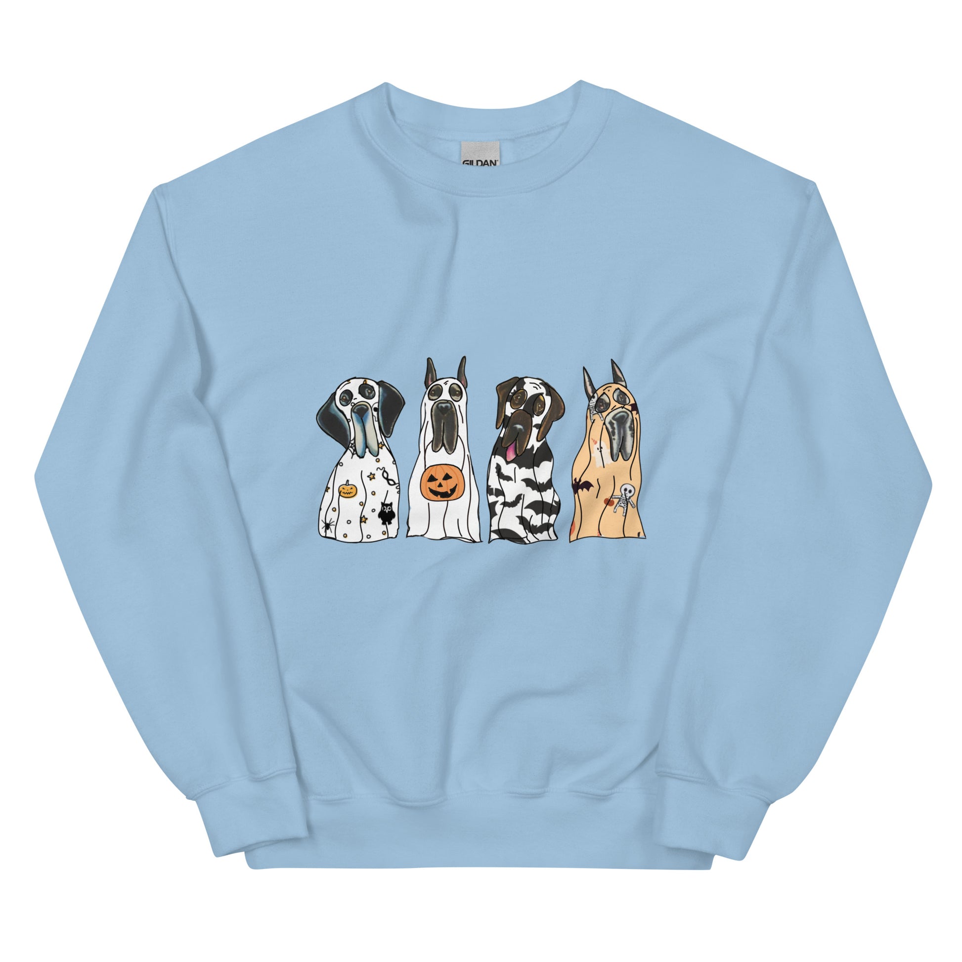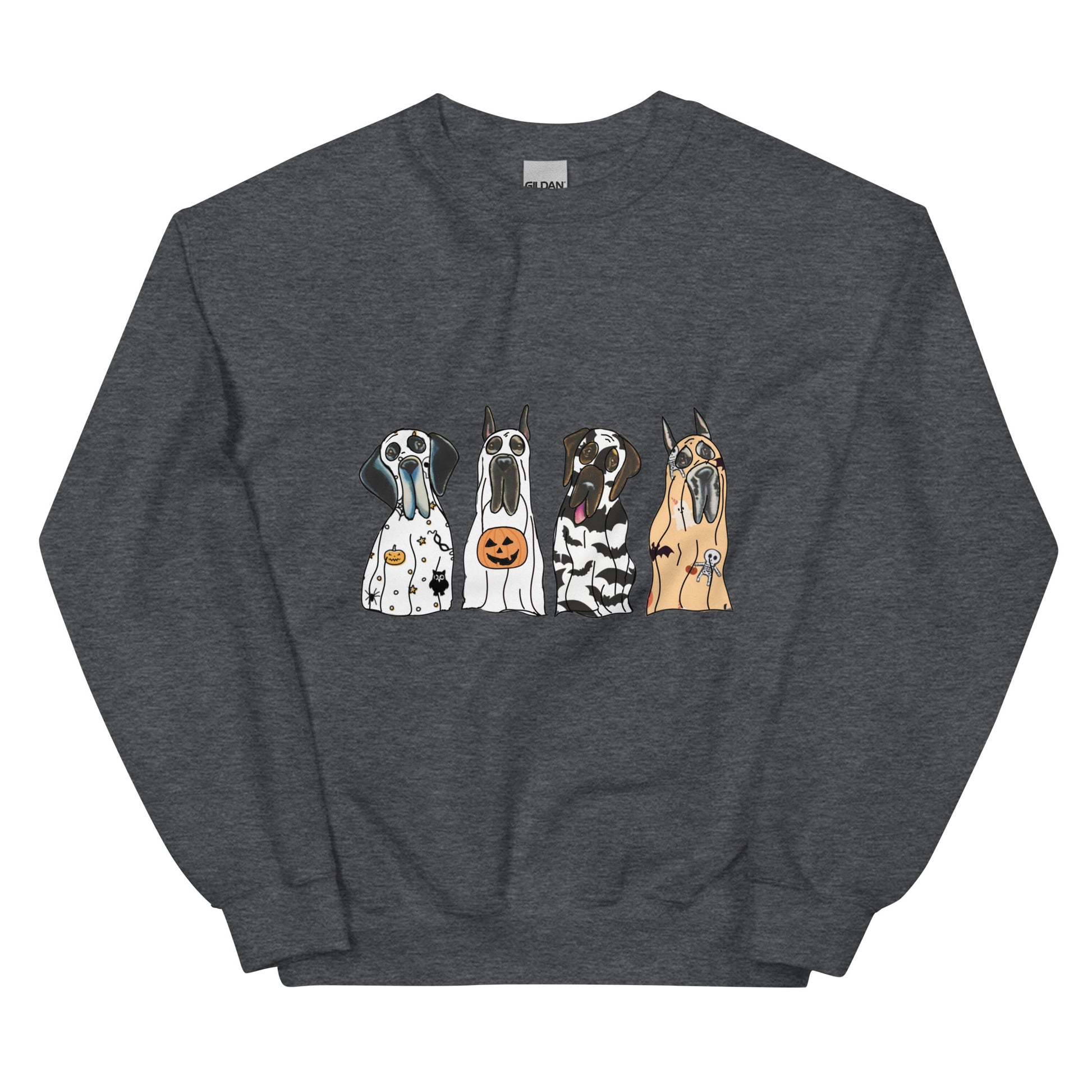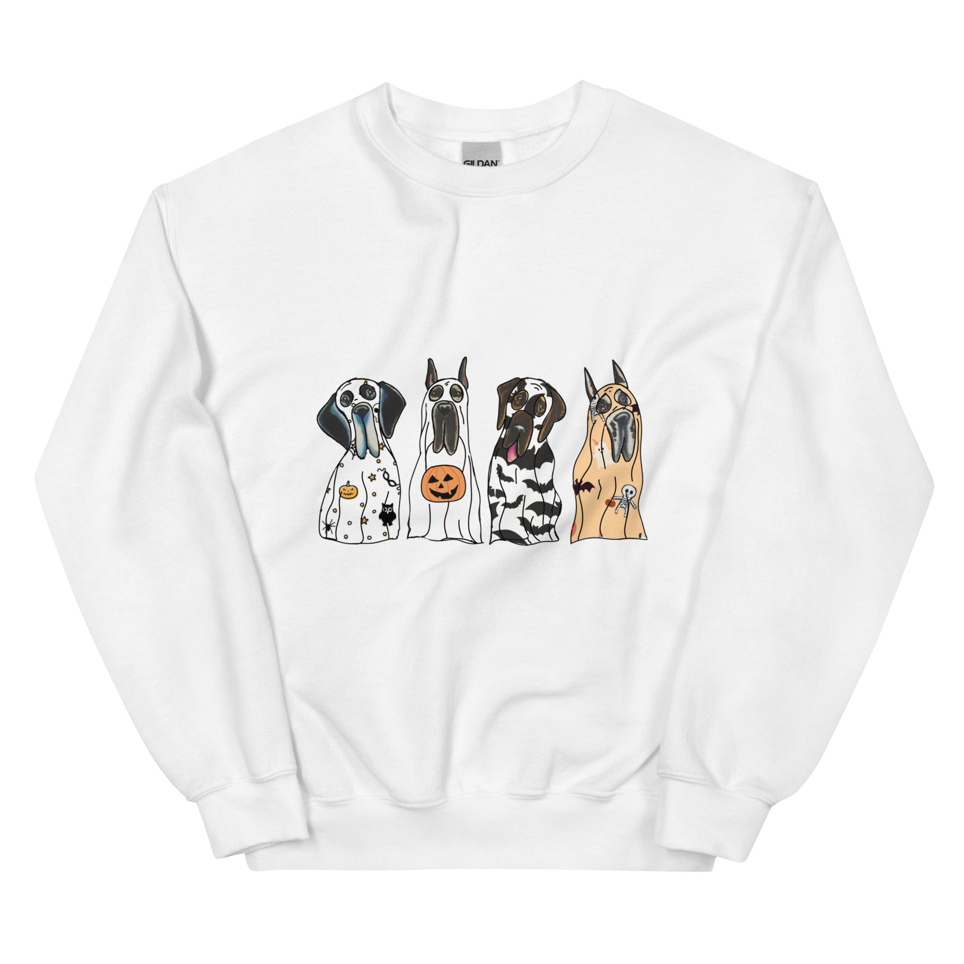 Introducing our 'Spooky Dane Crew' Pullover Sweatshirt – a chillingly charming addition to your closet! This eerie crewneck features four adorable Great Danes donning ghostly sheets, exuding a fun and spooky vibe. Crafted with soft, breathable materials, it ensures a comfortable and stylish look all day long. Embrace the supernatural and grab yours now for a playful twist to your outfit!